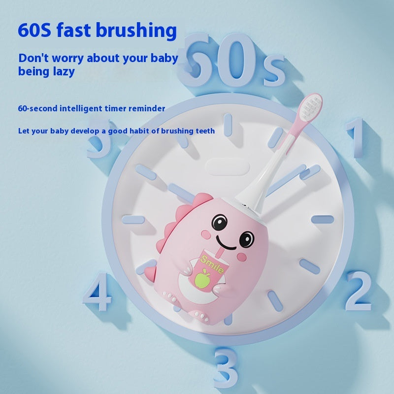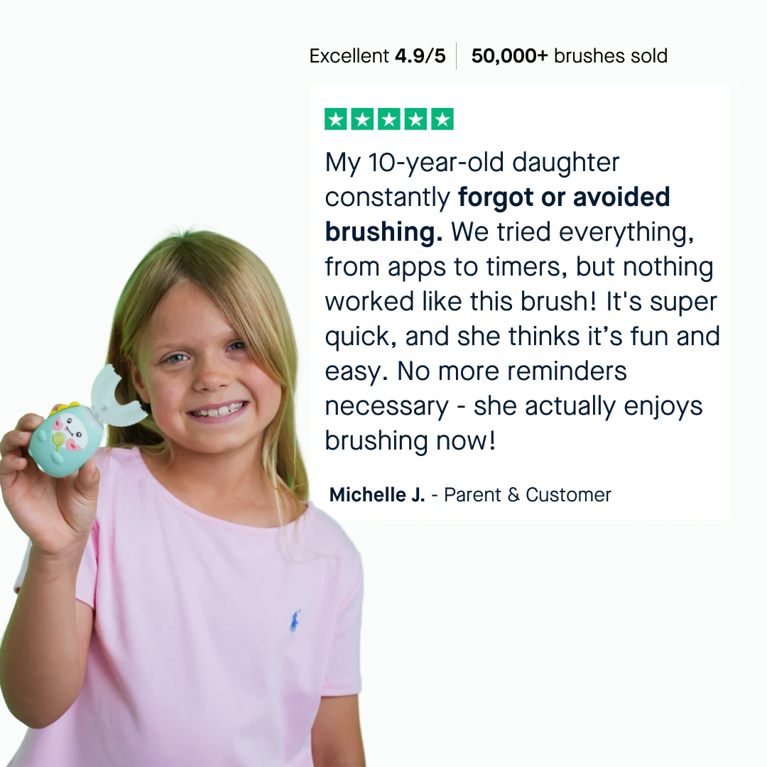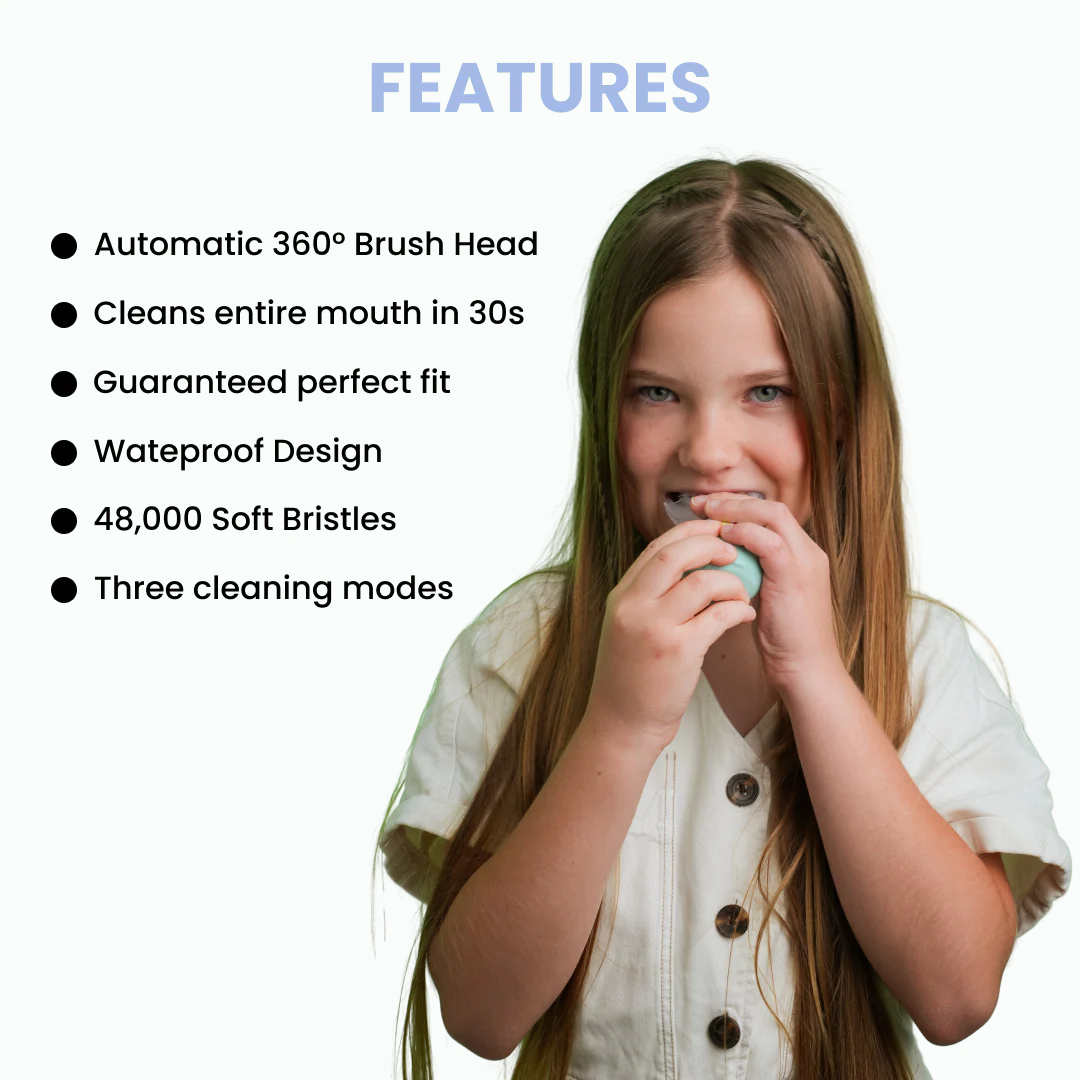 The Mesa Bellezza DinoGlow™ Smart Brush uses a soft U-shaped mouthpiece lined with gentle silicone bristles. Once placed in your child’s mouth, ultrasonic vibrations deliver a full 360° clean in just 45 seconds, covering every tooth at once. The waterproof, rechargeable design makes it easy for kids to use daily, while parents enjoy peace of mind knowing every brushing session is thorough, safe, and effective.
