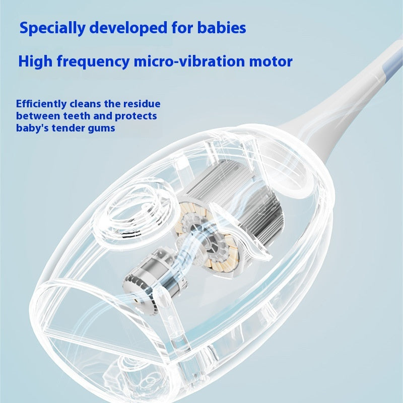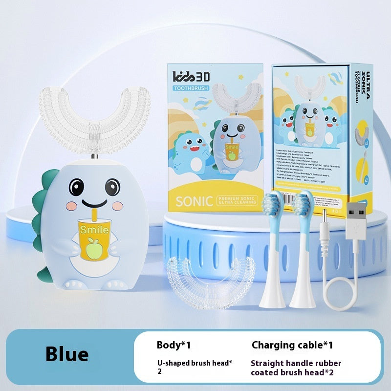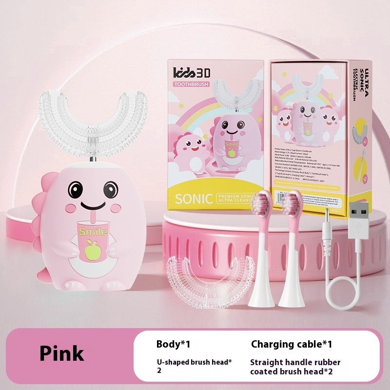The toothbrush uses ultrasonic technology combined with a soft U-shaped silicone mouthpiece. It vibrates gently to clean all teeth at once, reaching spots traditional brushes often miss.